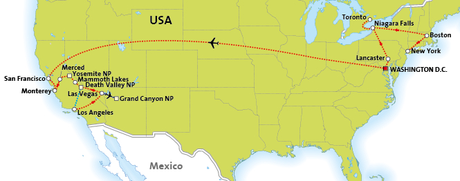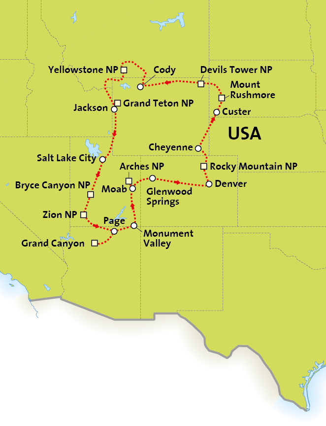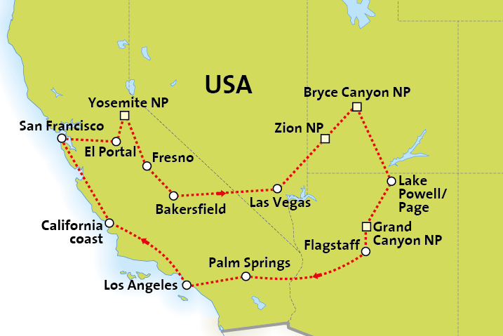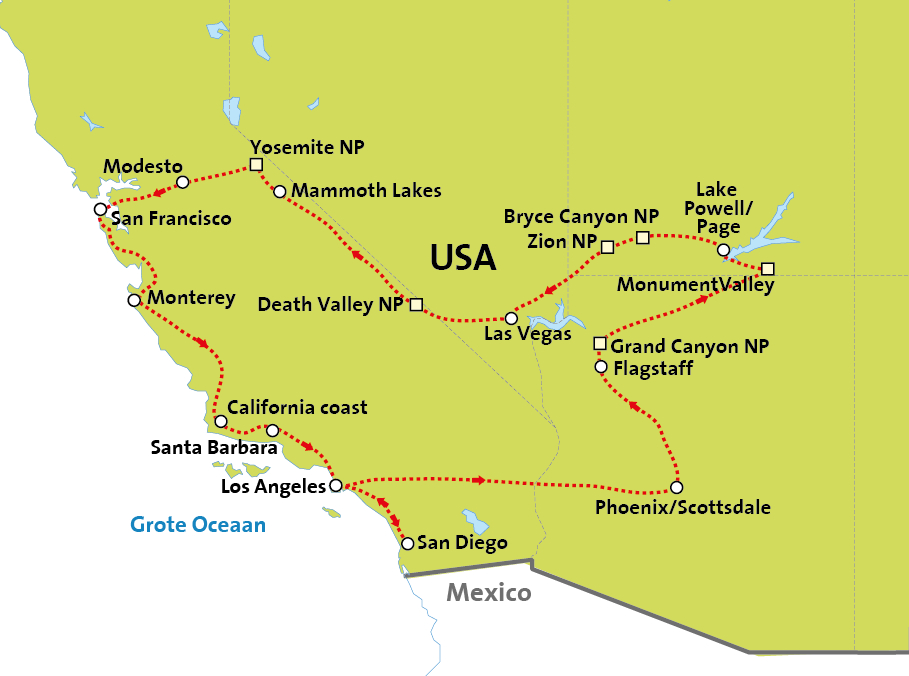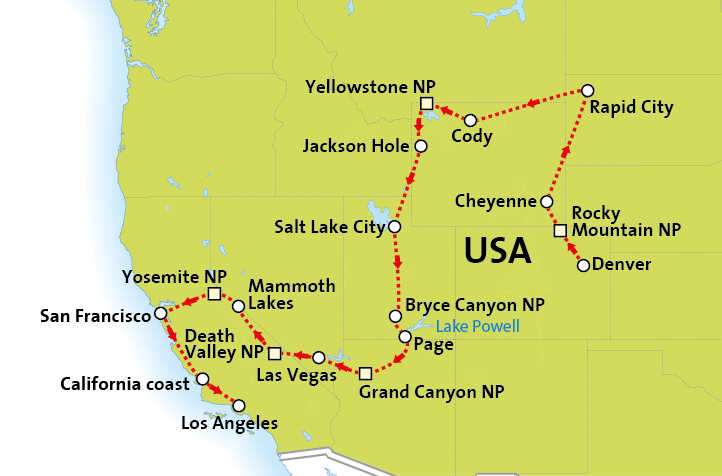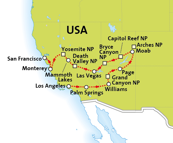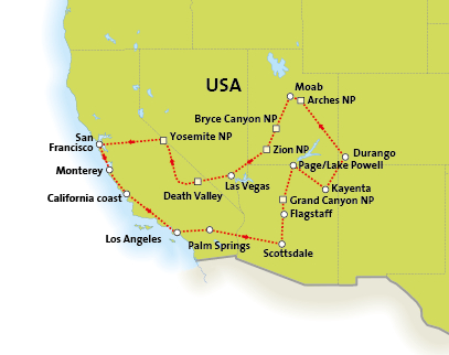 Onderstaande routekaartjes helpen u op weg om de rondreis door Amerika te kiezen die het beste past bij uw wensen. Onder elk kaartje kunt u een link aanklikken naar uitgebreide informatie over de rondreis, inclusief het dag tot dag programma en de prijzen.