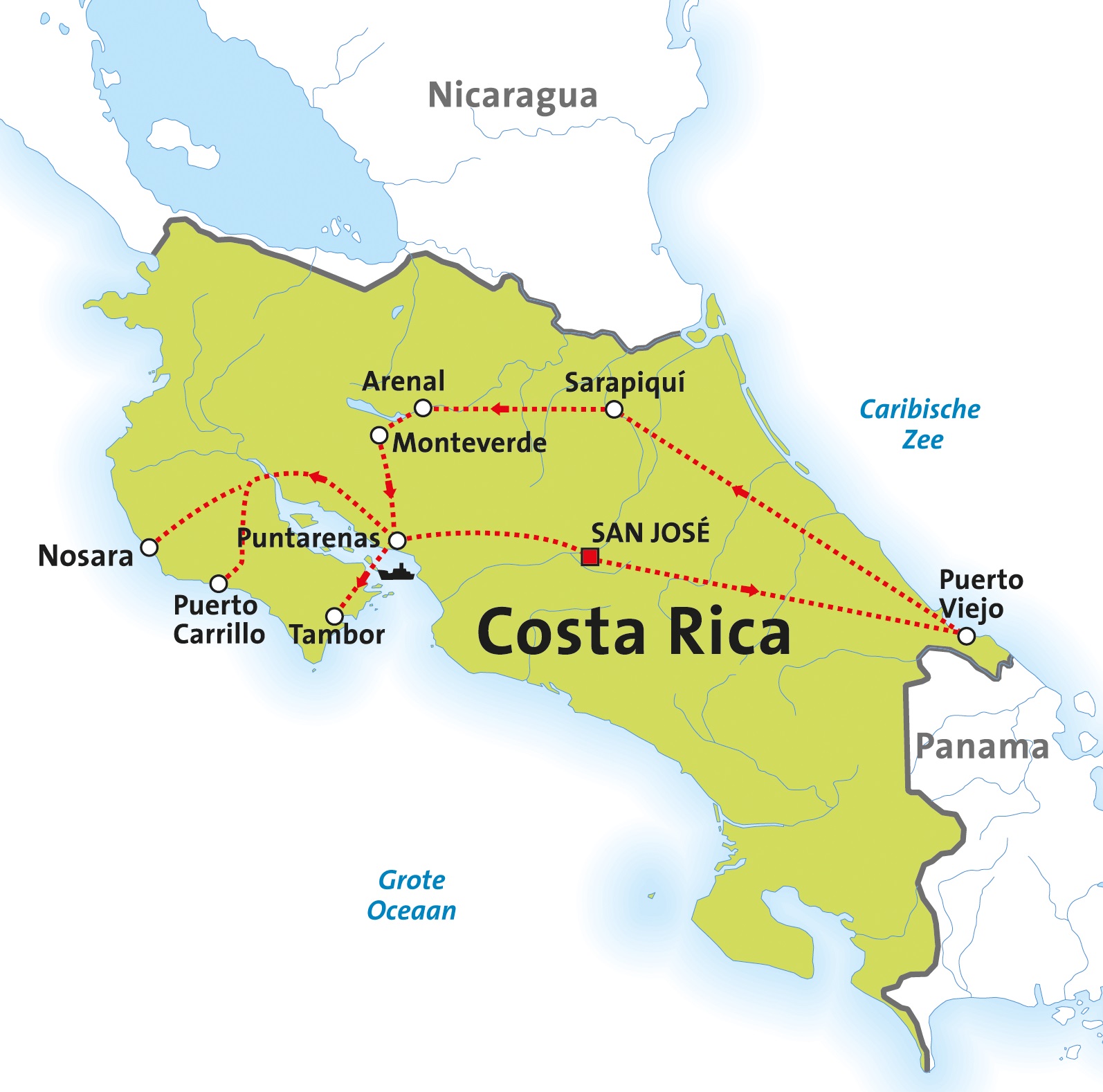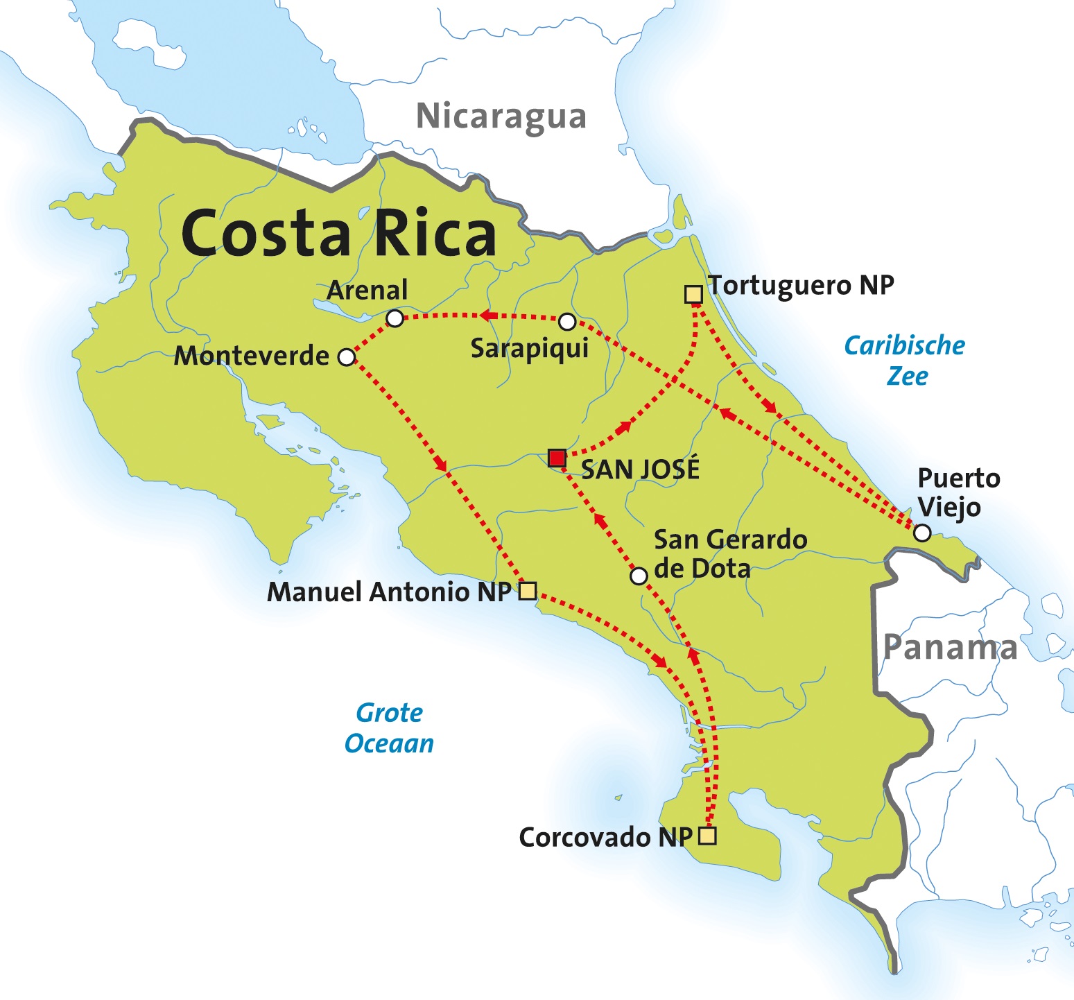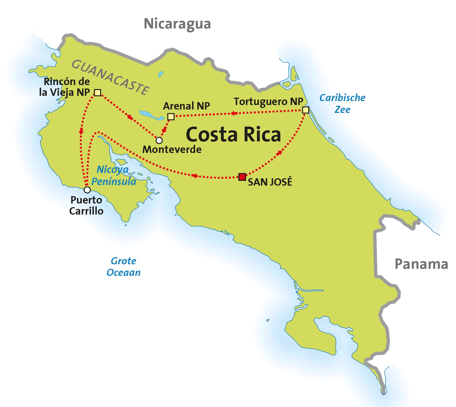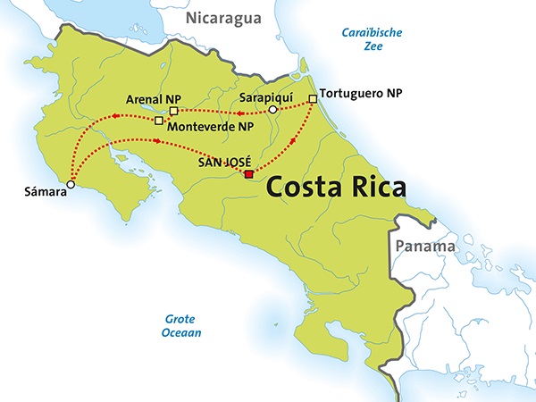 Onderstaande routekaartjes helpen u op weg om de rondreis door Costa Rica te kiezen die het beste past bij uw wensen. Onder elk kaartje kunt u een link aanklikken naar uitgebreide informatie over de rondreis, inclusief het dag tot dag programma en de prijzen.