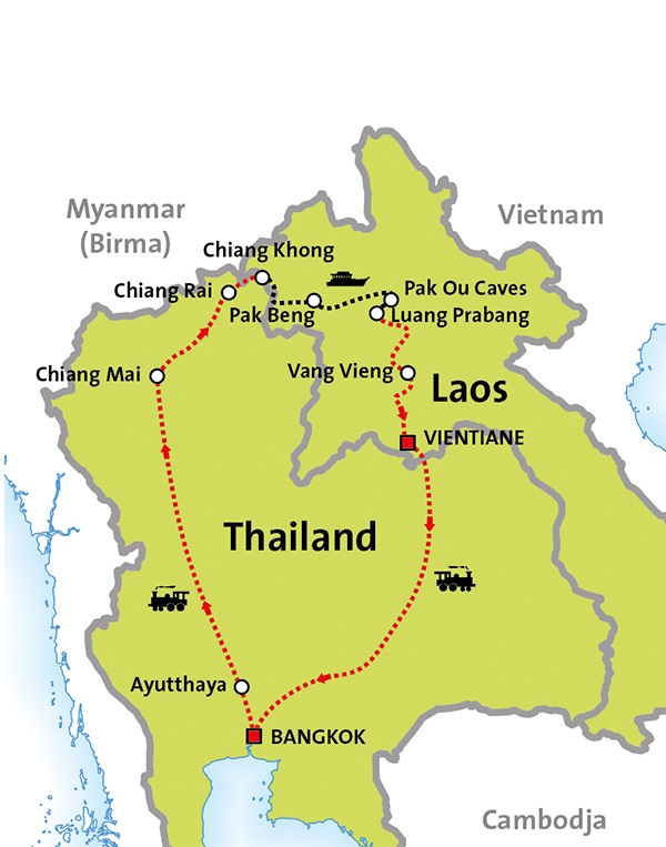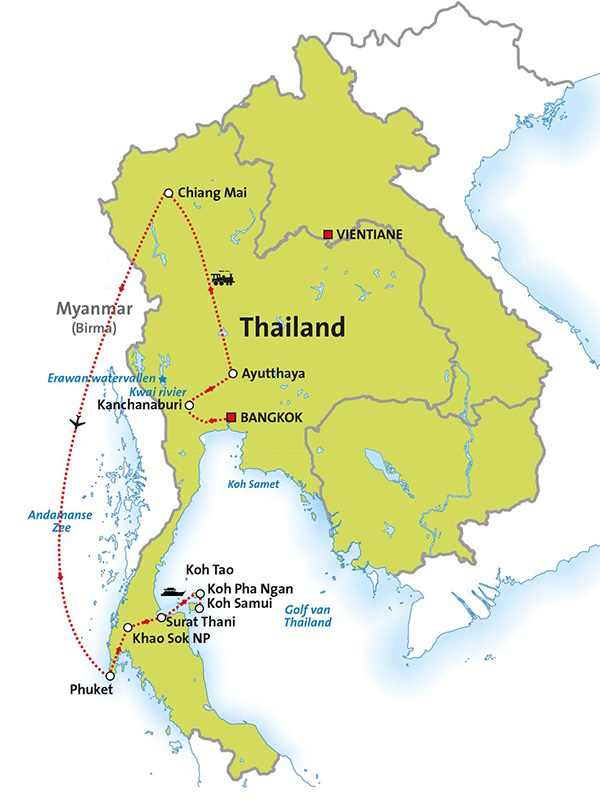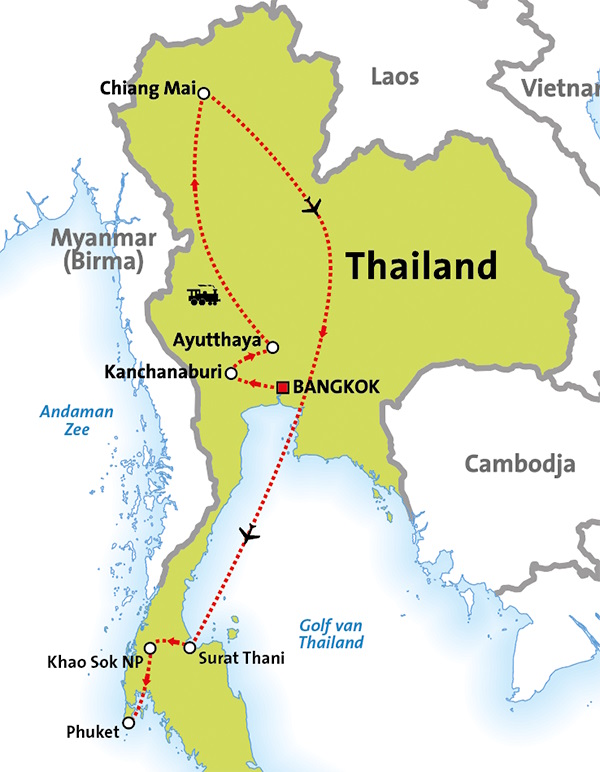 Onderstaande routekaartjes helpen u op weg om de rondreis door Thailand te kiezen die het beste past bij uw wensen. Onder elk kaartje kunt u een link aanklikken naar uitgebreide informatie over de rondreis, inclusief het dag tot dag programma en de prijzen.