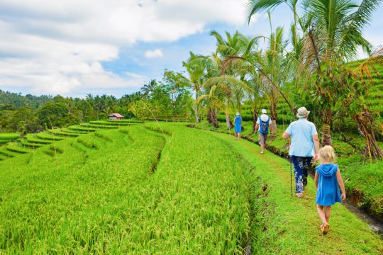 Dag 4Ubud: fietstochtNa het ontbijt word je opgehaald en per minibus naar het startpunt van de fietstocht gebracht. Nadat je een fijne mountainbike hebt uitgezocht voor jezelf en de kinderen (kleine kinderen kunnen bij de ouders achterop), start de tocht. Tijdens de fietstocht door de achterlanden van Ubud word je begeleid door een ervaren gids. De route en het tempo worden aangepast aan jouw gezin en de eventueel andere deelnemende families. Af en toe zal het heuvel(tje) op flink trappen zijn, maar je komt daardoor wel op bijzondere plekjes. Je fietst langs rijstvelden, tempels en langs huizen met kleine fabriekjes. Hier zie je bijvoorbeeld hoe ze meubels maken, kokosnoten of suiker verwerken of fruit uit eigen tuin verkopen. Onderweg vertelt de gids over het Balinese leven. Het laatste deel van de fietstocht gaat voornamelijk bergafwaarts. Nadat de wind door je haren heeft gesuisd, is het tijd voor de lunch in een lokaal restaurant. Nadat jullie hebben genoten reis je rond half één weer terug naar je hotel. De rest van de middag heb je de tijd om lekker met de kids te luieren aan het zwembad, of juist door de straatjes in en rondom het centrum te struinen. (O,L)