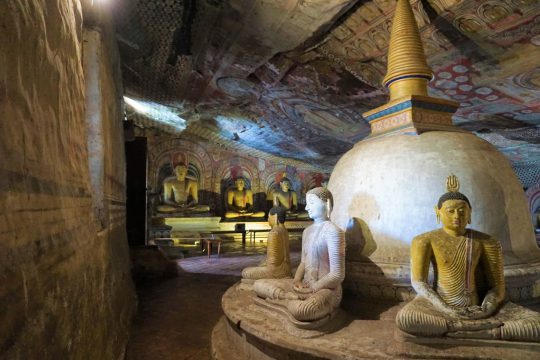 De vijf grotten liggen op ca. 100 meter hoogte en zijn per trappen bereikbaar. Voor veel koningen hebben de grotten, met schitterende wandschilderingen, als schuilplaats gediend. Drie van de vijf grotten zijn het best bewaard gebleven. In de eerste grot ligt een ruim 15 meter lange uit de rots gehouwen boeddha en vindt u fresco's op de muren, die dateren uit de 15e eeuw. De tweede grot is de grootste en het meest indrukwekkend. Hier bevinden zich 150 levensgrote beelden van goden, waaronder beelden van de Hindoeïstische goden Vishnu en Ganesha. Het plafond is versierd met fresco's, die gebeurtenissen in het leven van boeddha uitbeelden en belangrijke fragmenten uit de geschiedenis van de Singalezen. Rondom Dambulla liggen andere, weinig bezochte, bezienswaardigheden. Ten oosten van Dambulla ligt de Kalu Diyapokunna tempel en ten noordwesten Ritigala, een eeuwenoud boeddhistisch klooster. Beide zijn overigens overwoekerd door de jungle.