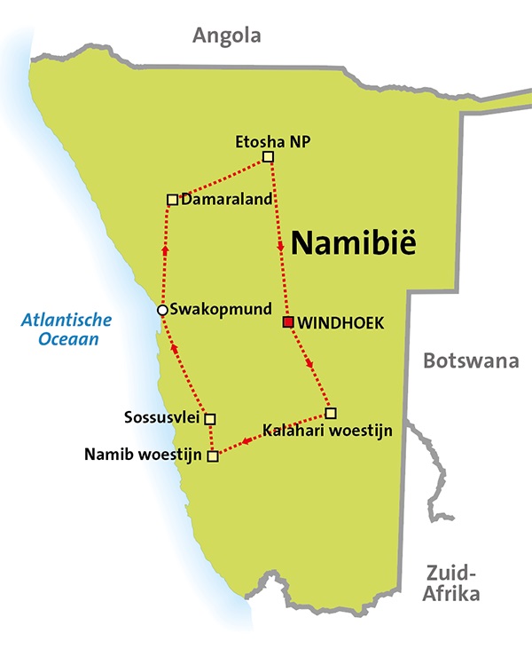Mooie autorondreis door de fotogenieke landschappen van Namibië. Maak tijdens vele optionele excursies kennis met de woestijnen, de kust, de bevolking, dieren en Etosha National Park.