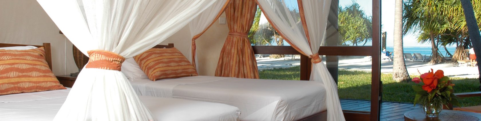 Direct aan een zandstrand aan de noordoostkust bij Pwani Mchangani, op ca. 45 minuten rijden van de luchthaven en Stone Town.