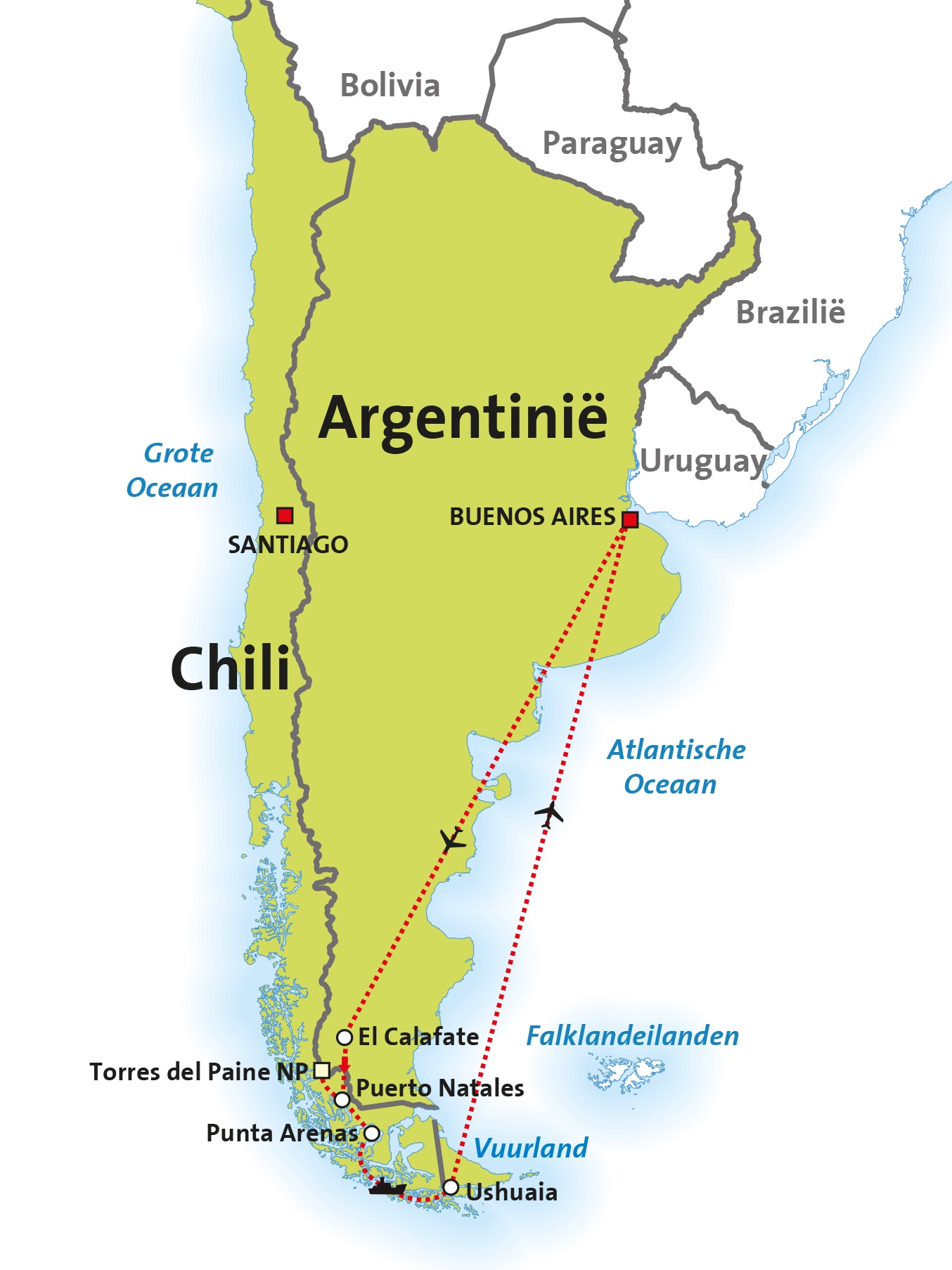 Tijdens de Best of Patagonia maakt u een vergelijkbare rondreis maar dan zonder de cruise-expeditie. Deze reis begint in Santiago de Chile en eindigt in Buenos Aires.