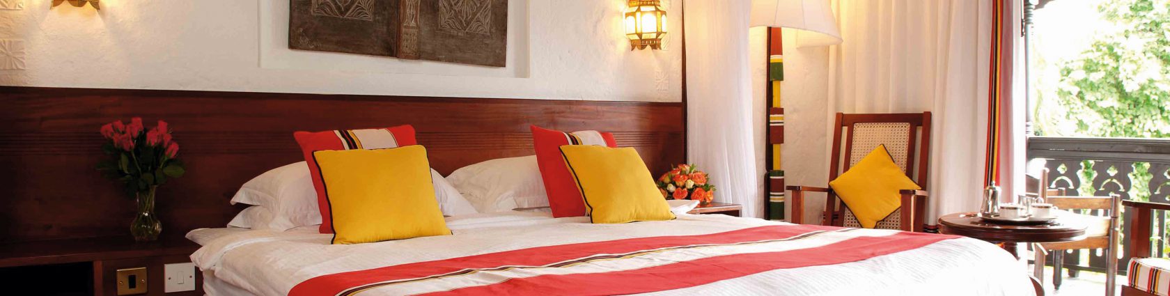 De ruime garden kamers/superiorkamers worden omringd door palmbomen en hebben onderbroken zeezicht. De kamers beschikken over een queensize bed of twee eenpersoonsbedden, muskietennet, airco, tv, WiFi (gratis), minibar, koffie- en theezetfaciliteiten, kluisje, inloopdouche en een balkon of terras. De familiekamers hebben een slaapkamer met een kingsize bed en een slaapkamer met twee eenpersoonsbedden en twee badkamers. De superior seaview kamers hebben een traditionele Swahili inrichting en uitzicht op de Indische Oceaan.