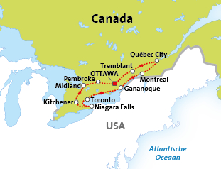 Vandaag bereikt u Ottawa, de hoofdstad van Ontario. De stad ligt aan de gelijknamige rivier in de provincie Ontario. Ottawa herbergt vele regeringsgebouwen, waarvan het parlementsgebouw het bekendst is. Hier vindt van juni tot en met augustus de wisseling van de wacht plaats. U heeft tijd om de vele bezienswaardigheden te bezoeken, wat ook heel goed mogelijk is op de fiets tijdens de Ottawa Bicycle Tour. Behalve de parlementsgebouwen zijn Embassy Row en de Byward market interessante plekken. Vanuit deze stad kunt u een bijzondere Ottawa River Cruise boottocht maken op het Rideau Canal. U overnacht in Ottawa.
