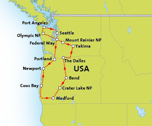 U rijdt vandaag de natuur tegemoet: Mount Rainier National Park is rijk aan weelderige bossen, gletsjers, bergmeren, rivieren en watervallen. In dit park ligt de 4392 meter hoge vulkaan Mount Rainier. Er leven ongeveer 50 soorten inheemse zoogdieren waaronder elanden, zwarte beren, coyotes en rode lynxen. In afgelegen gebieden komt zelfs de poema voor. U kunt stoppen in Longmire, voor een wandeling langs de Trail of the Shadows om dit gebied van dichtbij te bewonderen. De route gaat verder naar Yakima, waar u logeert.