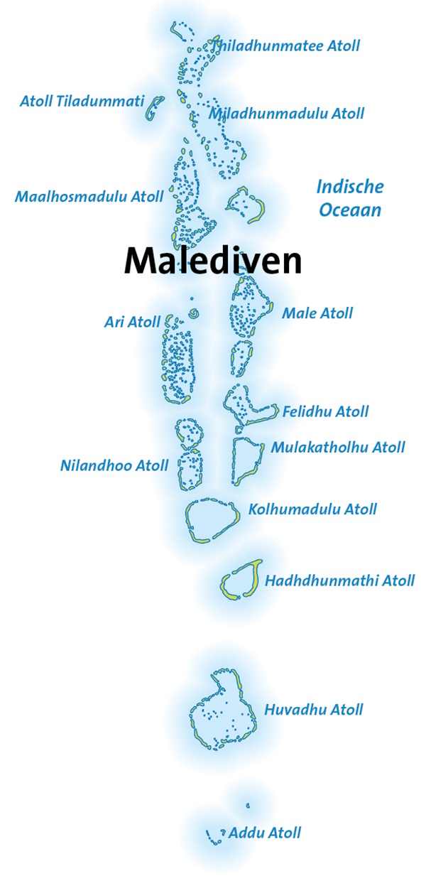 De tropische Malediven heten officieel de Republiek de Malediven en bestaan uit circa 1190 koraaleilanden waarvan het grootste eiland niet groter is dan 5 vierkante kilometer. Al deze minuscule eilandjes zijn omgeven door prachtig blauw water met witte zandstranden en wuivende palmbomen. De onderwaterwereld is zeer divers en kleurrijk en een paradijs voor snorkelaars en duikers.