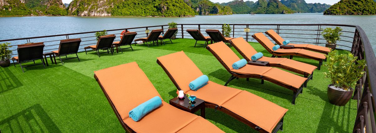 Geniet aan boord van een traditionele junk van eerste klasse faciliteiten, activiteiten zoals een kookworkshop en Tai Chi en van de prachtige omgeving in Halong Bay en Lan Ha Bay.