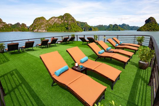 | Excerpt: Geniet aan boord van een traditionele junk van eerste klasse faciliteiten, activiteiten zoals een kookworkshop en Tai Chi en van de prachtige omgeving in Halong Bay en Lan Ha Bay. |