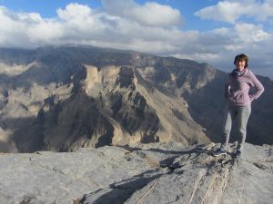 De volgende middag arriveren we in Jebel Shams in de uitlopers van het Al Hajargebergte, een verrassende regio van Oman (zie foto). Het laatste deel van de route leggen we af over een onverharde weg. Prima te doen met onze 4WD auto. Vanaf ons hotel is het een klein stukje rijden naar de rand van de kloof. We rijden er heen voor een schitterende zonsondergang. Ik had er foto’s van gezien, maar als je zelf aan de rand van deze zogenaamde ‘Grand Canyon van Oman’ staat en een uitzicht van 360 graden hebt, maakt het gebergte een onuitwisbare indruk. We ontmoeten er een gids die ons de volgende ochtend begeleidt tijdens een wandeling van ongeveer drie uur, een traject dat W6 wordt genoemd. Goed gemarkeerd en niet al te zwaar, dus ook zonder gids goed te doen. Bijna ging de wandeling niet door, want de hele nacht regent het pijpenstelen. Flink koud is het ook in dit hooggelegen gebied (ca. 2800 meter), we zijn blij met de verwarming in ons chalet. Gelukkig trekt tijdens het ontbijt het wolkendek open en maken we alsnog onze wandeling naar een ruïne en een mooi uitzichtpunt bij een waterval.