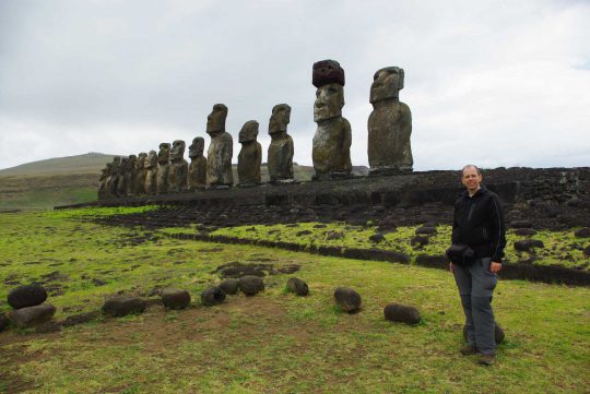 We maken de volgende dag een excursie over het eiland. We stoppen bij Rano Raraku. Dit is de plek waar alle moai’s uit de vulkaan gehakt werden, en bewerkt werden voordat ze naar hun uiteindelijke plaats getransporteerd werden. Dat is erg interessant om te zien. De moai’s werden altijd liggend uitgehakt, dan rechtop gezet om de achterkant te bewerken, vervolgens verticaal de berg af getransporteerd, en daarna horizontaal richting hun bestemming. De beelden werden uiteindelijk alleen aan de kust neergezet met hun gezicht naar het land gericht. Vlakbij de vulkaan is Ahu Tongariki, een mooi gerestaureerde site met een stuk of 10 moai’s op een rij.
