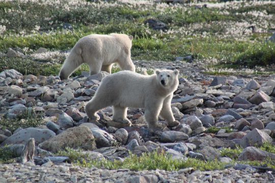 Vanwege hun witte vacht kun je ijsberen al op flinke afstand zien. Bij onze eerste poging zien we een moeder met twee jongen, die een aangespoeld scheepswrak besnuffelen. Later lopen ze voorbij over het strand. Een eindje verderop ligt een karkas van een beluga walvis, een lekker maaltje voor de beren. Het is nog vers en daarom hebben de beren het vermoedelijk nog niet geroken. Als we twee dagen later terugkeren is er nog maar weinig van het karkas over en zijn er maar liefst vijf beren in de buurt om de laatste restjes te verorberen. We zien weer een moeder met jongen, misschien zijn het dezelfde. Eerst ligt het gezinnetje te slapen, met de moeder als kussen. Zodra ze wakker worden heeft een van de jongen honger. Moeder richt zich op, gaat op haar gat zitten en legt haar poot over het zogende jong. Een onbetaalbaar plaatje.