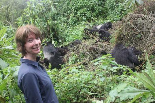En daar zijn ze dan! Een groep van vijftien gorilla’s, waaronder twee zilverruggen en een moeder met een tweeling van vijf maanden oud. Het is werkelijk magisch, ik heb er geen ander woord voor. We kunnen heel dichtbij komen en de gorilla’s vinden het prima. Ze houden ons in de gaten, maar storen zich niet aan ons bezoek. Ze vlooien elkaar, peuteren in hun neus of liggen een beetje te doezelen. Een van de jonge mannetjes, een kleuter nog, vindt het hartstikke leuk dat wij er zijn en haalt allerlei capriolen uit. Hij roffelt op zijn borst, maakt koprollen en komt op een bepaald moment zo dicht in de buurt dat wij hem bijna kunnen aanraken. Dat is niet de bedoeling, de ranger gebaart dat we wat naar achteren moeten lopen.