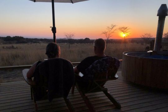 Na aankomst op Johannesburg wilden we snel op naar de eerste échte Afrikaanse ervaringen van deze reis! En hoe! Na zo’n 3 uur rijden vielen we met onze neuzen in de boter, want wát een uitzicht vanaf de veranda van onze tent! Meteen zagen we zebra’s bij een drinkplaats vlakbij. Hierna proostten we met bubbels op een mooi begin van de reis. Dat vond een nieuwsgierige struisvogel ook wel gezellig; die kwam even buurten. En toen ging de zon onder. Wat een prachtige kleuren! Tijd om de braai aan te steken, want dat hoort nu eenmaal bij het Afrikaanse campingleven. Inmiddels was de hottub op temperatuur en hebben we heerlijk gedobberd met z’n 4-en. Het allermooiste was ons uitzicht op een prachtige sterrenhemel en de vele vallende sterren. Een magische afsluiting van een perfecte eerste dag.
