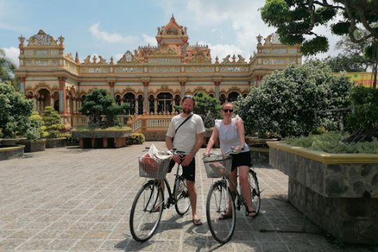 We overnachten vandaag bij een lokale familie in My Tho, wat een ontzettend leuke afwisseling is tijdens onze reis door Vietnam. De familie is erg gastvrij en ’s avonds wordt er een heerlijke maaltijd voor ons bereid. De volgende ochtend verkennen we de omgeving verder per fiets. Wat een leuke manier om dit te doen. Het fietsen is goed te doen langs de vlakke oevers van de Mekong Rivier. We fietsen over smalle bruggetjes en door mooie landschappen, langs de levendige markt van My Tho en de mooie Vinh Trang Pagode. Er is zóveel te zien onderweg.
