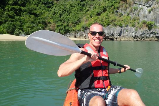 ’s Middags leggen we aan in een van de vele baaien voor de nacht. Maar eerst gaan we kajakken, zwemmen en genieten we van een smakelijk diner op het dek. De meeste mensen hebben slechts één nacht geboekt. Wij gelukkig niet! De tweede dag stappen we samen met slechts twee anderen over op een andere boot en cruisen verder door het prachtige landschap. We gaan aan wal op het grootste eiland: Cat Ba Island. Het weer is schitterend, we maken een fietstocht en bezoeken het dorp. Na een heerlijke lunch (veel!) op de boot hebben we tijd om te kajakken en zwemmen tussen de lijmstenen kliffen en verlaten strandjes. Dit zijn de ervaringen die je de rest van je leven bijblijven! Eenmaal terug op de junk dineren we onder de sterrenhemel en laten het eten ons smaken. De laatste dag keert het schip terug naar Hai Pong maar niet voordat we een grottencomplex bezocht hebben op een ander gedeelte van Cat Ba Island. Met pijn in ons hart nemen we afscheid van de vriendelijke bemanning. Deze herinnering gaan we koesteren!
